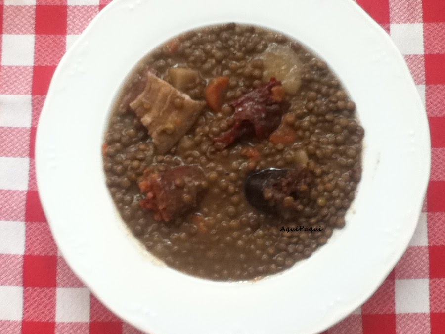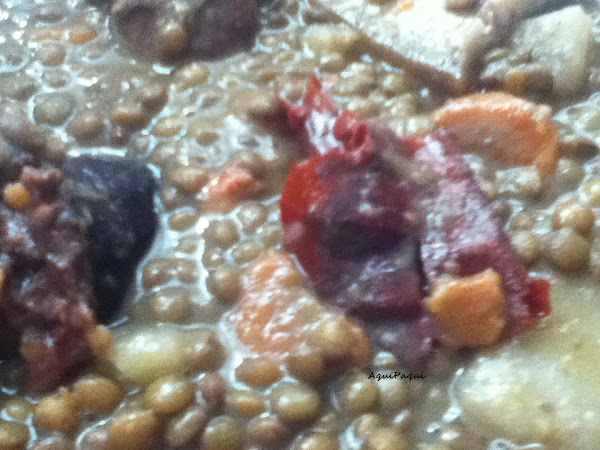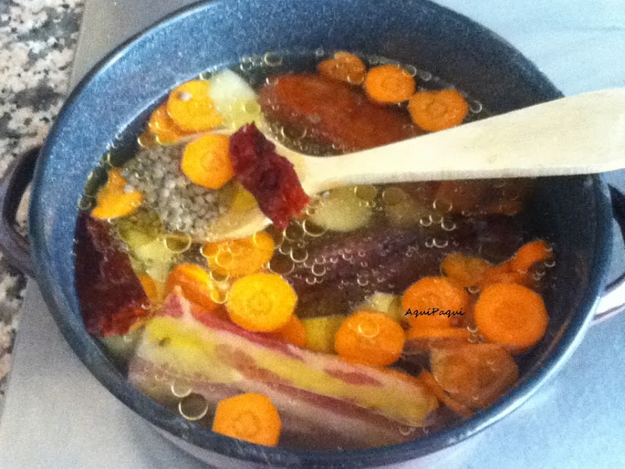 Poner las lentejas en remojo 2 o 3 horas. En una cazuela poner todos los ingredientes y agua hasta cubrir.