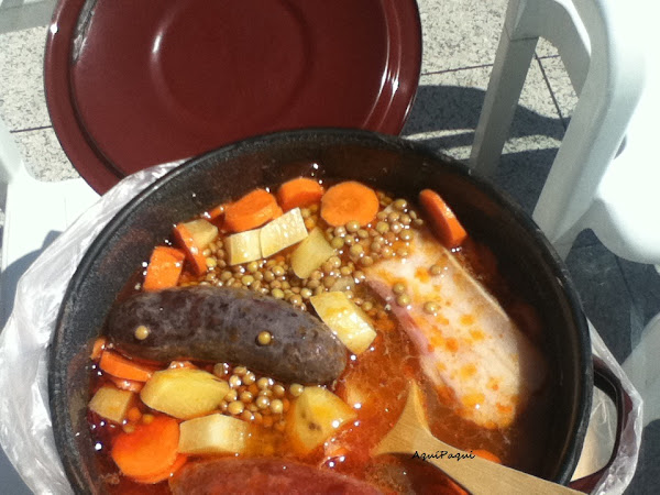 Pasada una hora y media abrí para ver como iba, necesitaba mas caldo, añadí un vaso y removí un poco con una cuchara de palo. Vuelta a meter en la bolsa y al parasol. A las 3 horas mas o menos he vuelto a mirar y he quitado un poco de grasa, de caldo estaban bien.