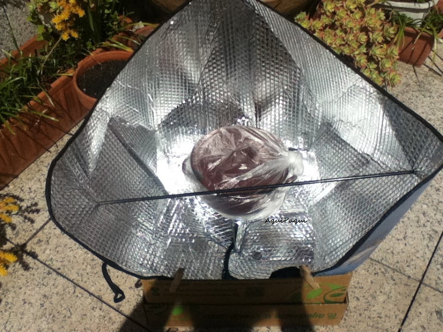 Al sol, pues ya sabes en una cazuela oscura pongo todos los ingredientes y el mínimo de agua para que los cubra. Meto la cazuela en una bolsa de plástico transparente (mejor si es una bolsa para el horno, esta vez no tenía una bolsa de horno suficientemente grande y utilicé una normal) y la pongo encima de la rejilla en la cocina solar casera que he hecho con el parasol.