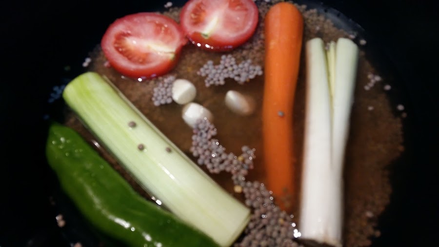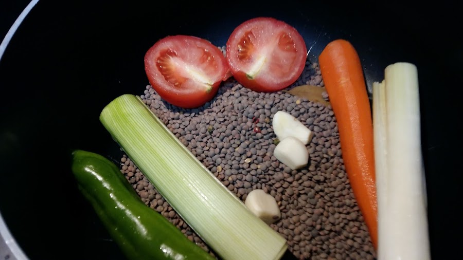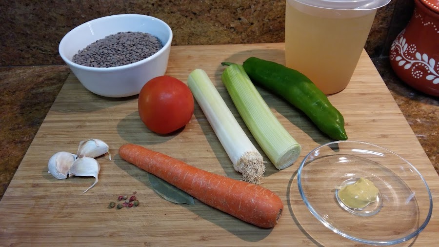 300 gr de lentejas rápidas,1L de caldo de verduras, 3 dientes de ajo, 1 puerro, 1 zanahoria, 1 pimiento verde, 1 tomate, 1 hoja de laurel, pimienta en grano, una cucharadita de mostaza.