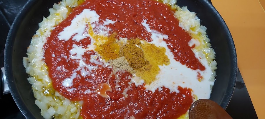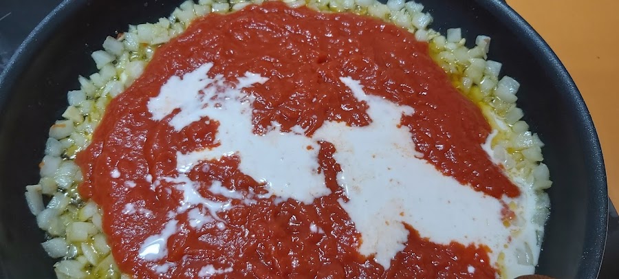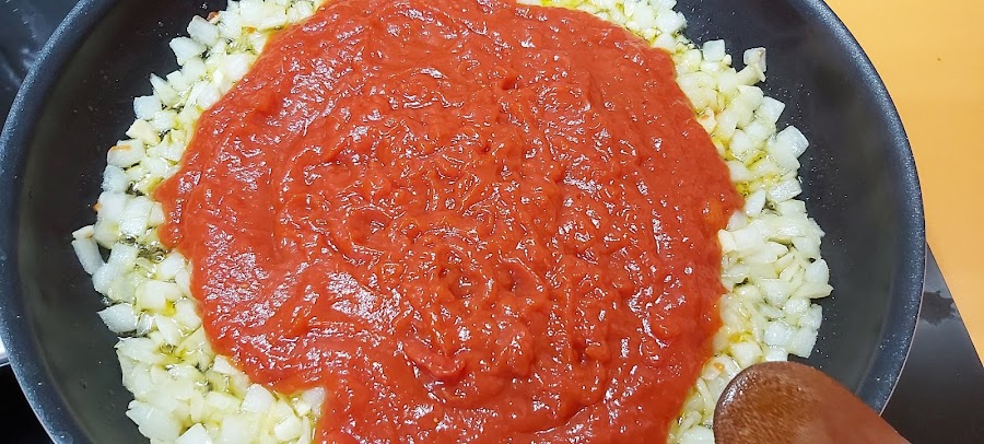 Cuando se empiecen a dorar añadimos la salsa de tomate.