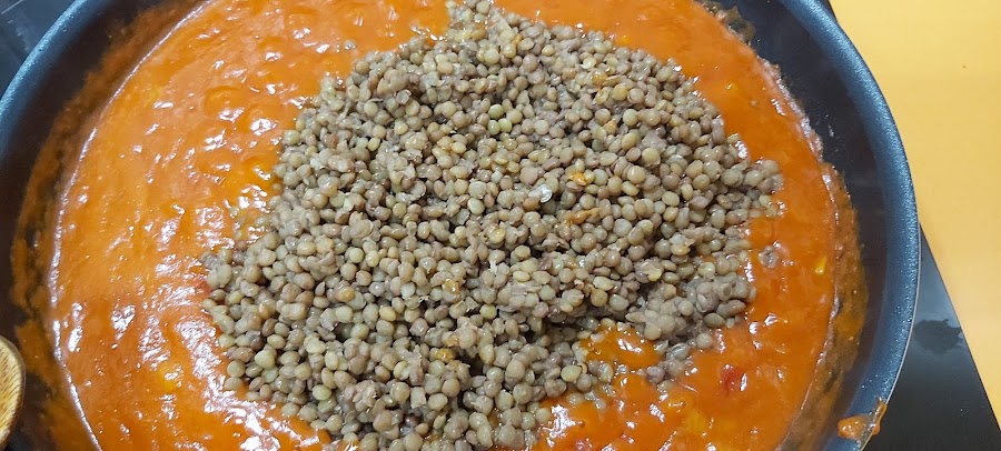 Removemos bien y pasados cinco minutos añadimos las lentejas, removemos y dejamos 10 o 15 minutos.