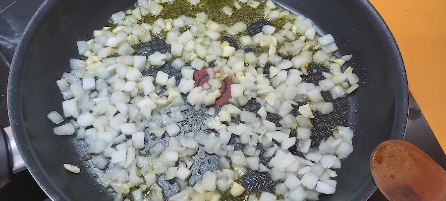 En una sartén ponemos un poco de AOVE y cuando esté caliente echamos los ajos y la cebolla picados.
