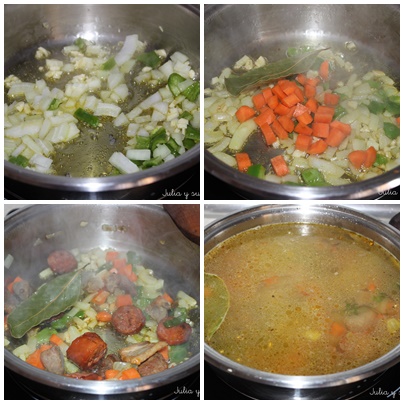 Ponemos el aceite en una cazuela, cuando esté caliente sofreímos la cebolla , el ajo, el pimiento y la zanahoria picados. Añadimos el laurel y la carne o chorizo si le ponemos.