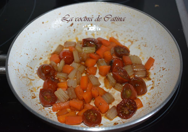 Cortamos el resto de la zanahoria y el apio en dados, mezclamos con los tomates, el resto del aceite, el azúcar y una pizca de sal y salteamos durante unos minutos hasta que las verduras estén tiernas.