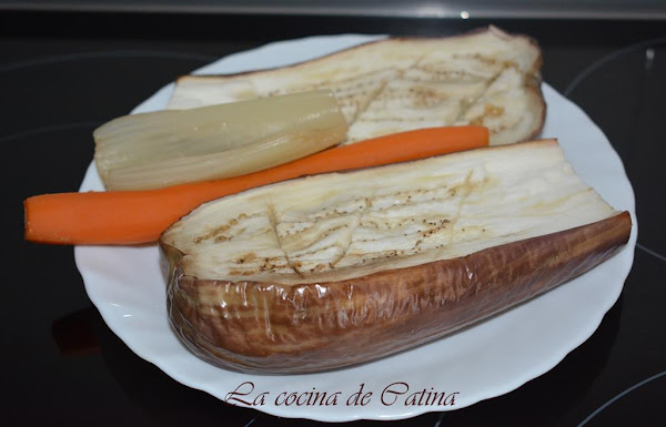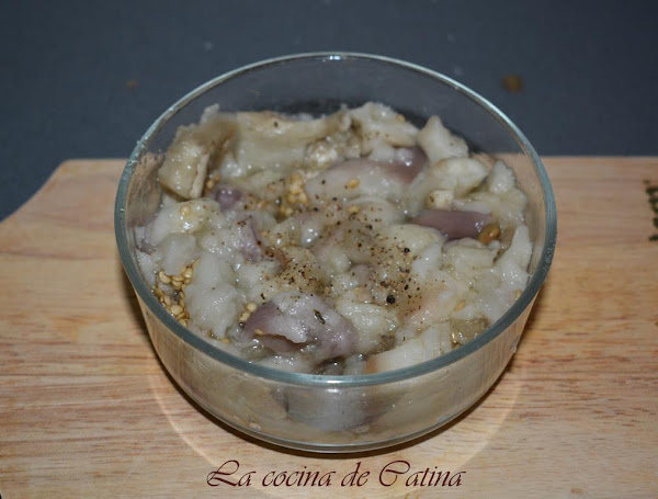 Cortamos las berenjenas por la mitad, les hacemos unos cortes y las asamos en el horno durante 20 minutos, (yo las he asado en el microondas a 700 vatios durante 5 minutos). Una vez asadas, les quitamos la piel, las ponemos en un colador y las dejamos escurrir durante 15 minutos mínimo, y a continuación las ponemos en un bol, salpimentamos y rociamos con media cucharada de vinagre.