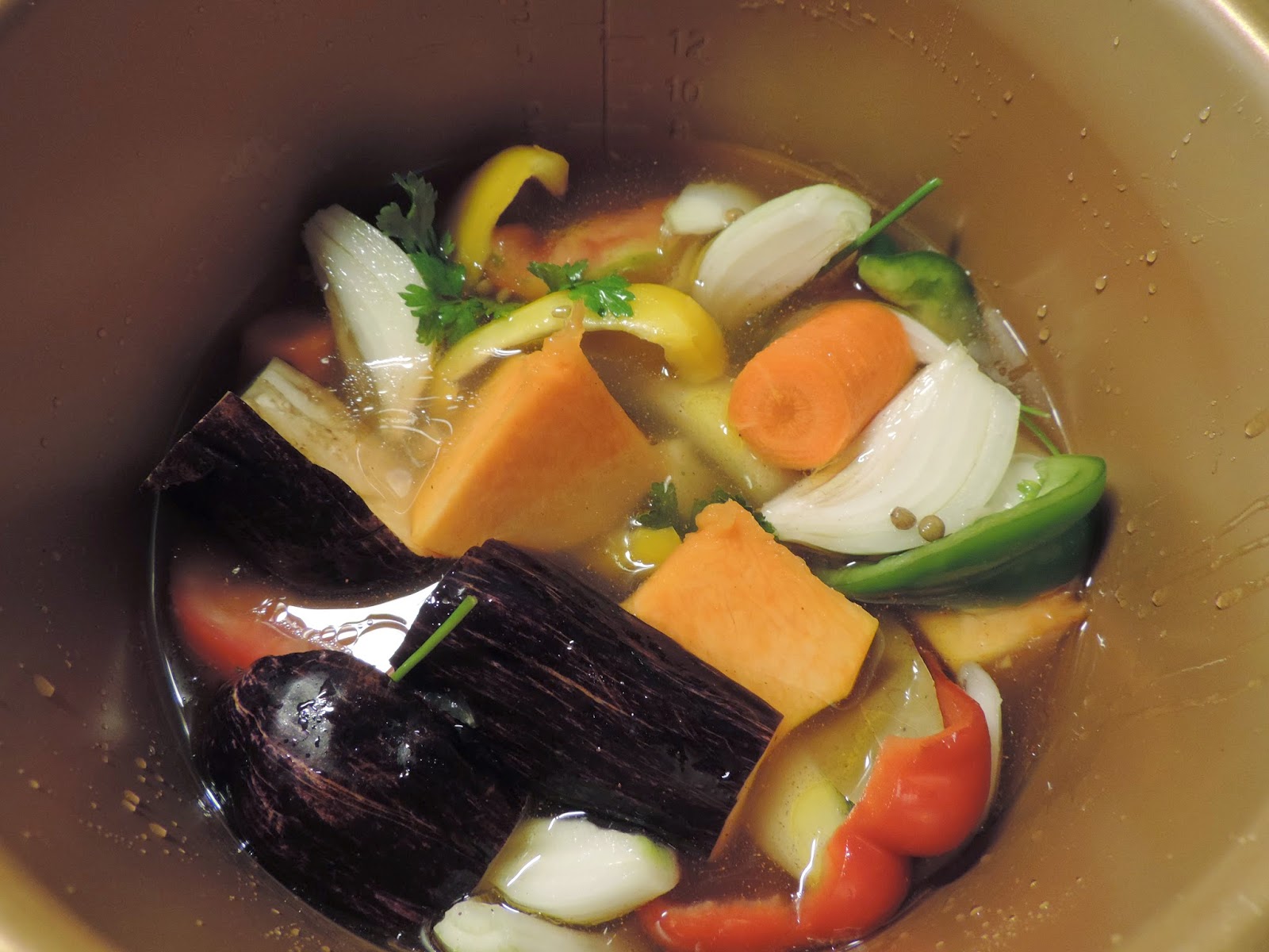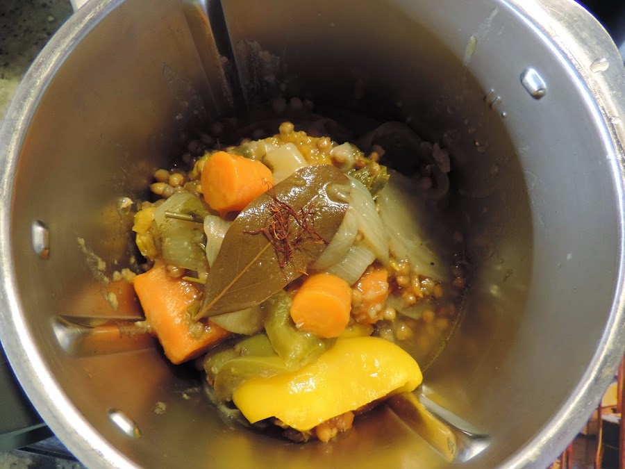 Sacamos las verduras, el caldo y 1 de las hojas de laurel y lo ponemos en el vaso del thermomix, añadimos también unas hebras de azafrán.