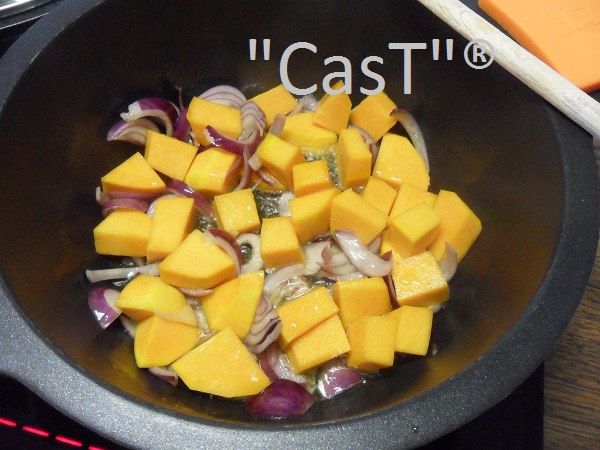 Añadimos la calabaza pelada y partida en trozos pequeños.