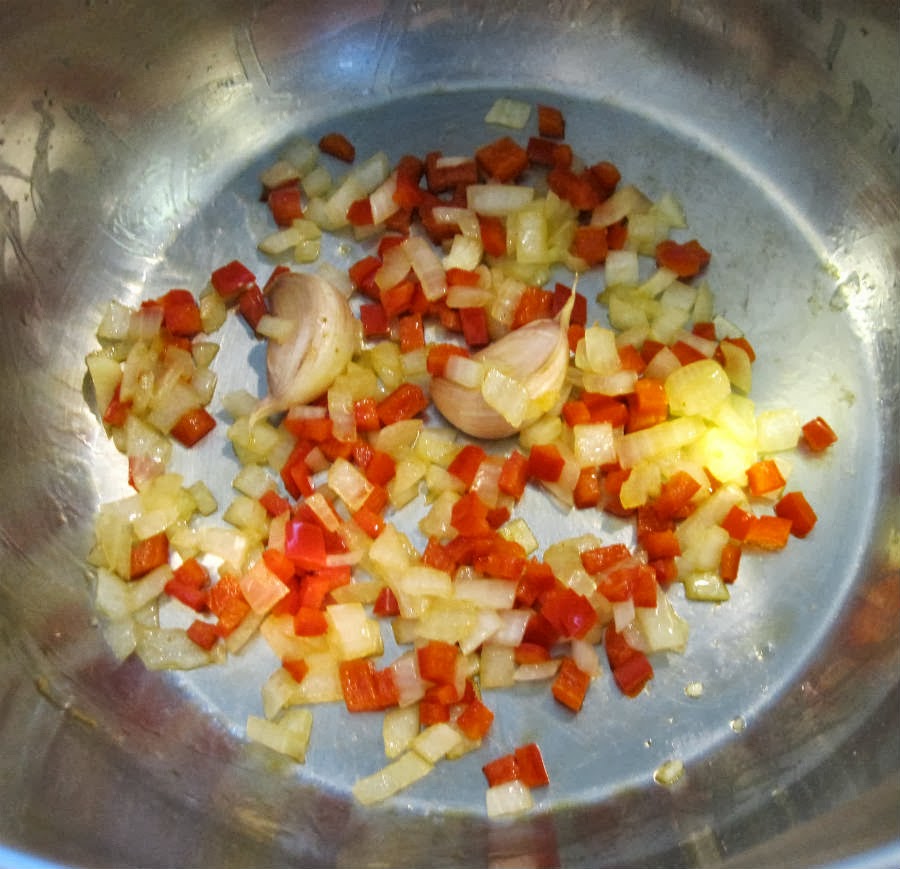 3. Pon una olla al fuego con un churretón de aceite a fuego medio. Yo no suelo cubrir todo el fondo, con un chorrito para rehogar la verdura es suficiente. Cuando esté caliente añade la cebolla, el pimiento, los dos ajos (sin pelar), un poquito de sal y rehoga durante unos minutos.