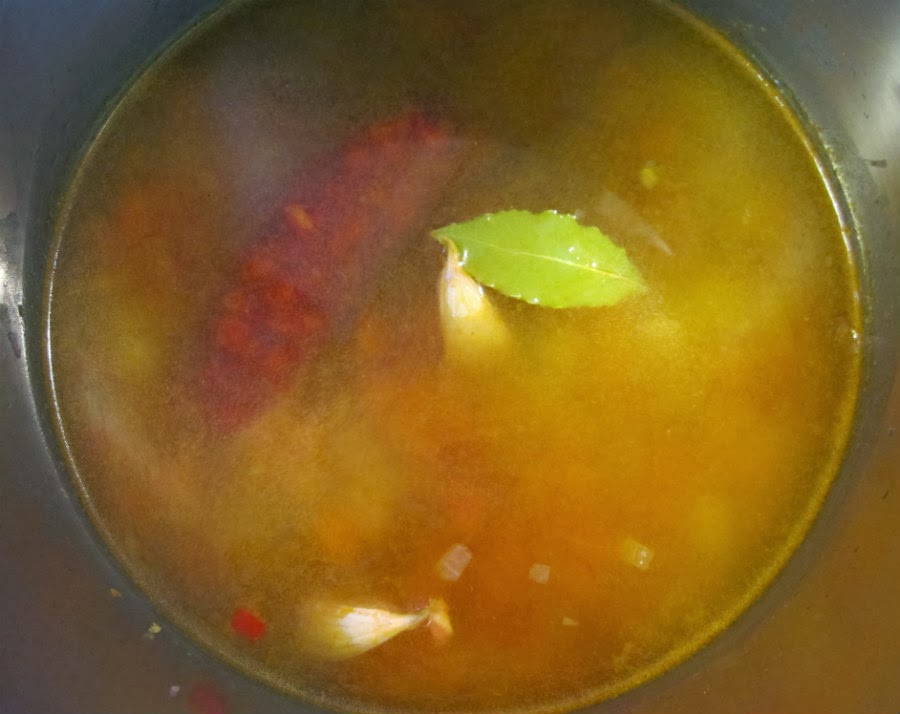 6. Sin necesidad de rehogarlas añadimos agua fría. Tiene que cubrirlas como dos dedos por encima de ellas. En este paso incorpora también el chorizo entero, la hoja de laurel y una cucharadita de sal. Aunque no sería necesario ya que el chorizo le da mucho sabor al guiso, podrías añadirle media pastillita de caldo de jamón concentrado, pero este paso es opcional. En este paso también podrías echarle una hebra de azafrán o un polvito de colorante alimenticio para resaltar el color (en esta ocasión yo no lo he echado porque el chorizo ya le aporta color).