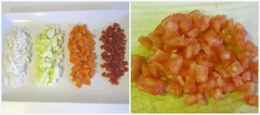 2. A continuación, pica en trozos pequeños la cebolla, el pimiento, la patata, la zanahoria y el tomate (pelado y retirando las pepitas).