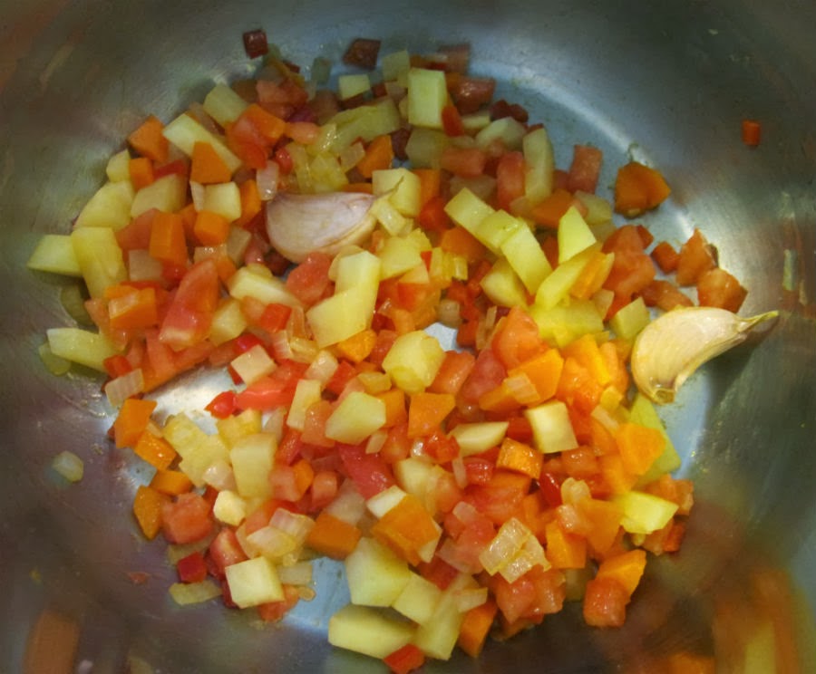 4. Ahora añade la patata, la zanahoria y, tras volver a rehogar un poquito, por último añade el tomate picado. Remueve bien para que se haga la verdura. Es opcional pero en este paso puedes echar una pizquina de comino (muy poquito, una miseria, que le de un toque al guiso pero que no lo sature de ese sabor tan característico).