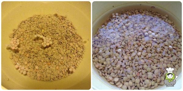 La noche anterior a prepararlas, debemos poner en remojo las lentejas en un bol u olla amplia (ya que crecerán) y con abundante agua.