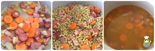Ya el día en cuestión, pelamos y picamos en trozos grandes la cebolla y en rodajas la zanahoria y las sofreímos en una olla grande con un poco de aceite de oliva (no es necesario poner mucho porque tanto el chorizo como la panceta van a soltar grasa).
