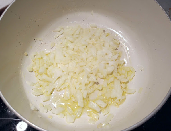 2. Mientras se rehogan los ajos, picamos la cebolla. También pequeñita para que, tanto los ajos como la cebolla terminen casi deshaciéndose y no se encuentren en el estofado. Se añade la cebolla y se sigue rehogando. Echamos un poco de sal.