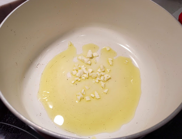 1. Picamos los ajos finitos y los ponemos a rehogar en una olla con un buen chorro de aceite de oliva a fuego medio.