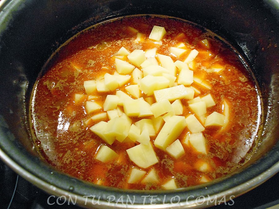 6. Añadimos las patatas cortadas en daditos y lo dejamos que siga cociendo hasta que estén hechas, pueden ser otros 20 minutos o un poco más. Probamos y rectificamos de sal si han quedado un poco sosas.