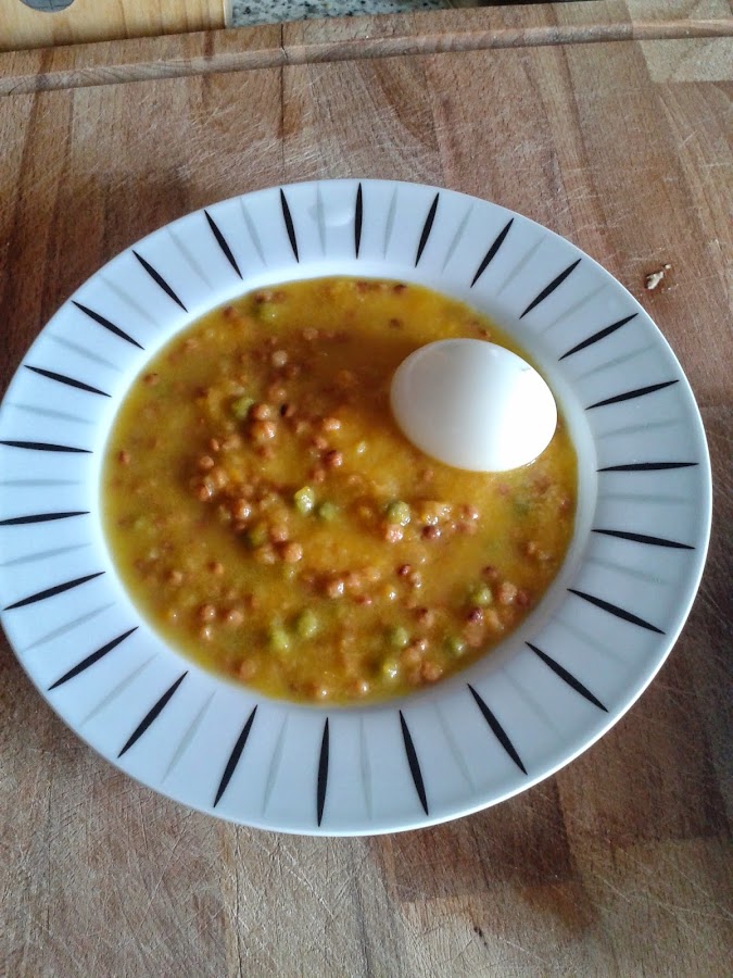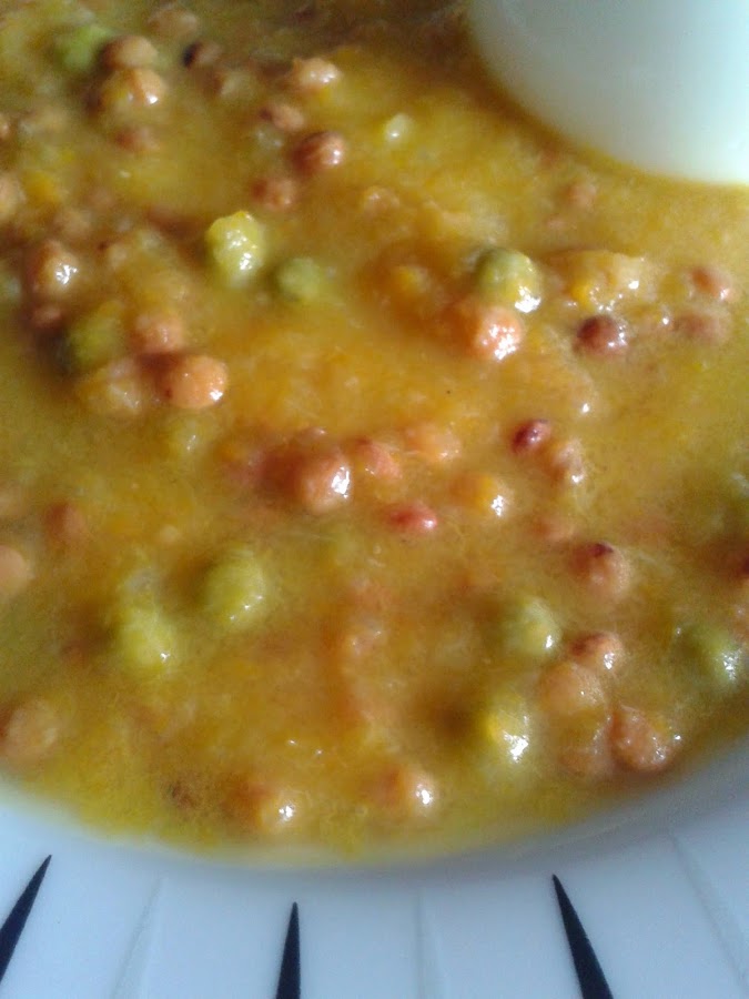Ahora volvermos a nuestra olla y pasamos la batidora por toda la crema hasta obtener una cremita suave y homogénea, una vez lista añadiremos las lentejas, los guisantes y el curry en polvo. Dejamos dar un hervor y retiramos del fuego.