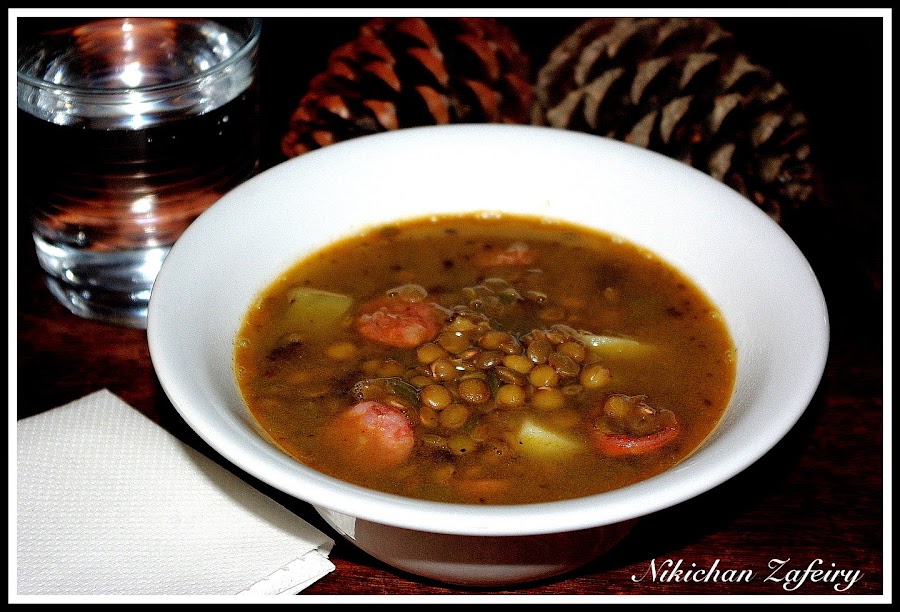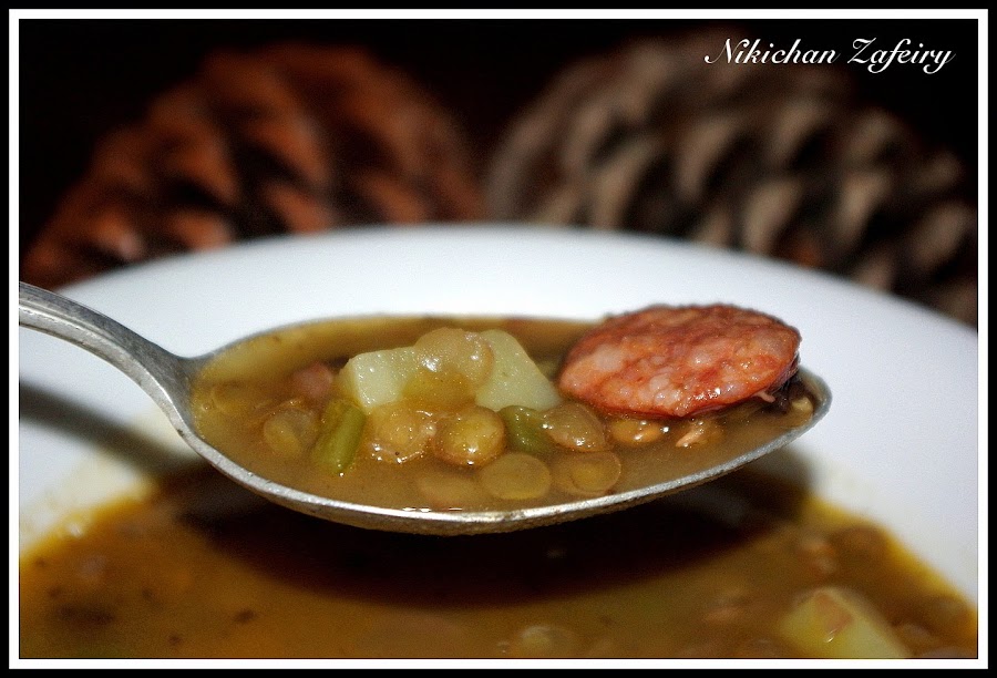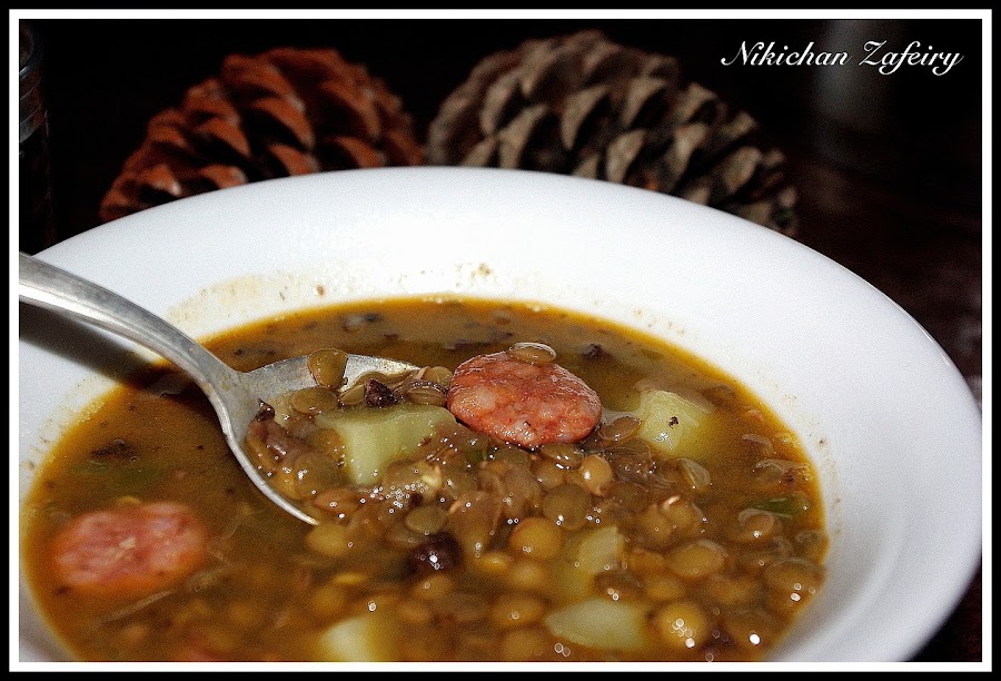 Preparé un puchero calentito de lentejas muy sencillas. Tenía unos chorrizos frescos para barbacoa de 4 tipos que no pude utilizar en su día porque llovía y los congelé. Viendo el tiempo que hace este es el mejor uso que podía darles sin duda. La morcilla se integró casi por completo en la salsa y con el toque especiado y picantito de los otros chorizos salió un plato fabuloso.