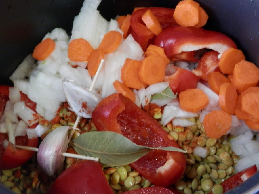 Echa en la olla, las lentejas, la zanahoria, los ajos y el laurel.