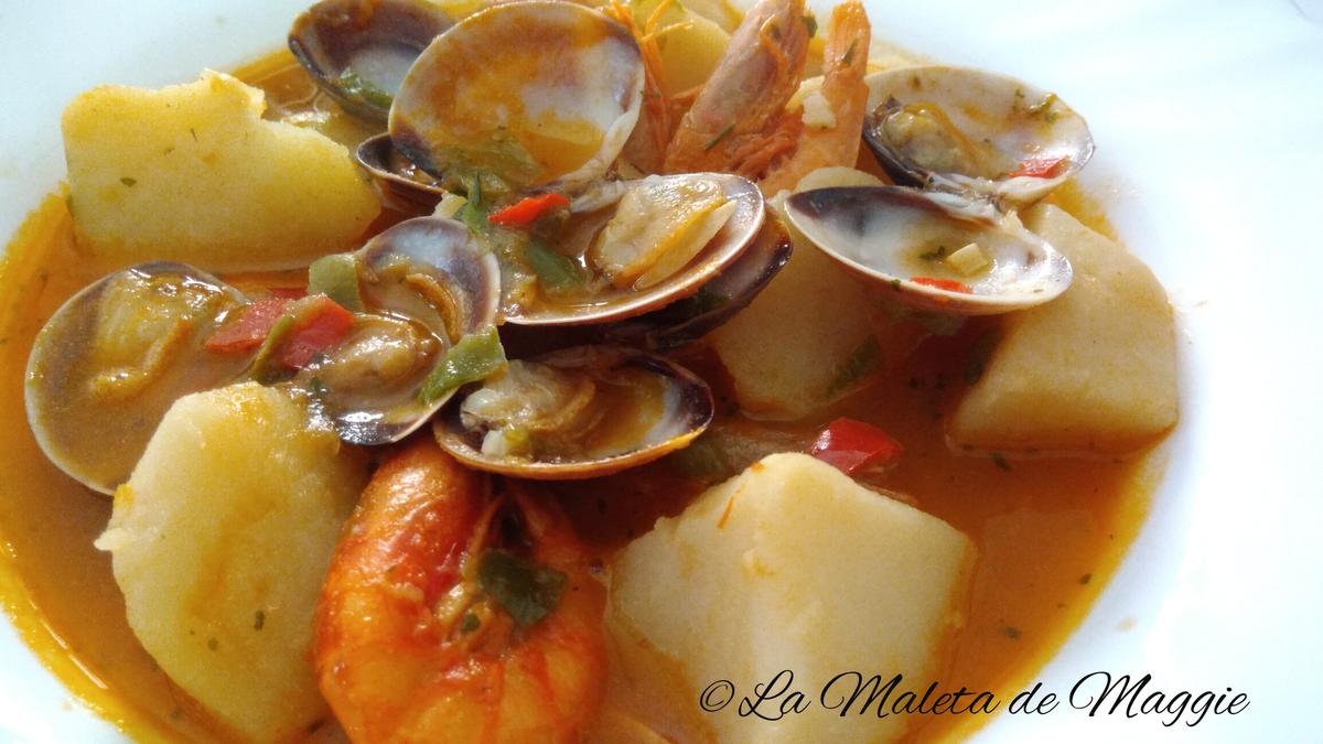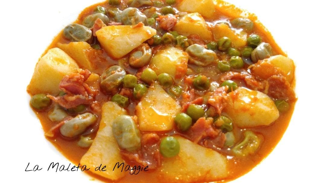 Guiso de frijoles con pimiento choricero, guiso de patatas con alcachofas y mejillones.