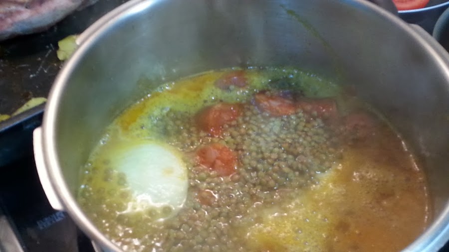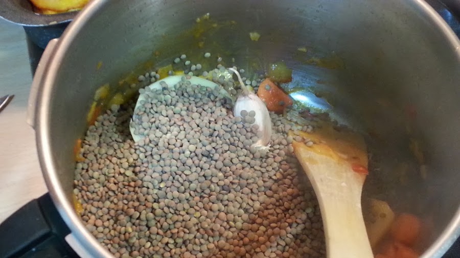 Echais aceite en el fondo de la cazuela donde vais a cocinar las lentejas y sofreis en ella media cebolla que habeis picado finamente, salais y pochais a fuego medio siempre