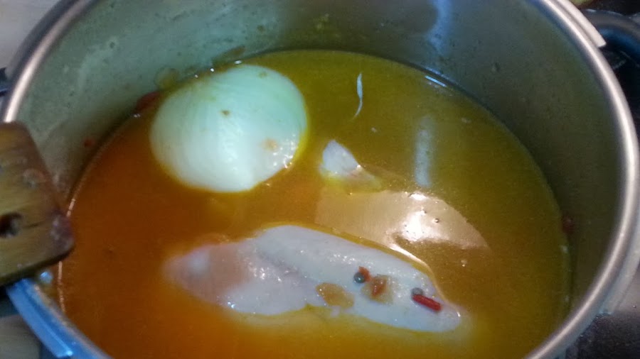 momento ahora una vez bien sellada la pechuga de echar la otra media cebolla entera y el otro ajo....