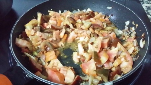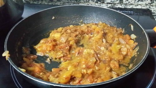 · Cuando la cebolla esté transparente, agregamos el tomate en dados.