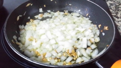 · Agregamos media cebolla picada y dos de los dientes de ajos también picados.