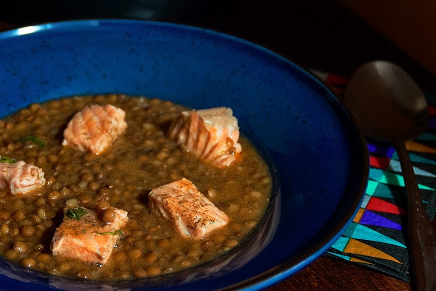 El plato que hoy os traigo es de esos que llevaba esperando preparar desde hace unos meses. De todas las legumbres, mis favoritas son las lentejas. Mi madre las prepara como los ángeles (que seguro que comen lentejas), pero siempre con chorizo, ya ha sido más de mayor cuando he descubierto que con pescado o marisco están bueníiiisimas y con salmón están para morirse.