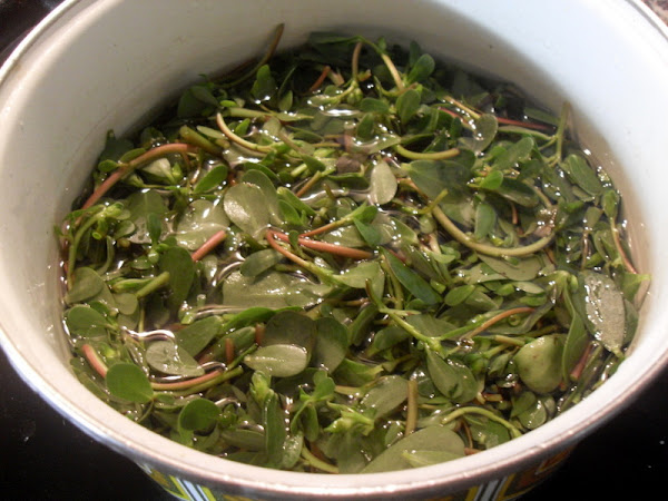 Poner en una cazuela las verdolagas con un poco de agua que cubra y una pizca de sal.