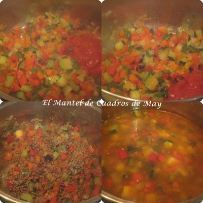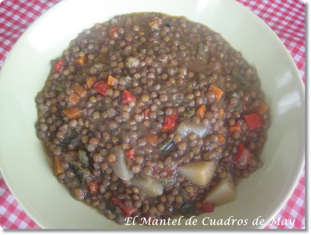 Las lentejas, se escogen por si traen alguna piedrecita, yo las pongo en agua, más que nada para lavarlas, el tiempo que estoy rehogando las verduras, estas lentejas pardinas no necesitan remojo. Se echan a la cazuela y se da unas cuantas vueltas para que se mezclen bien con las verduras.