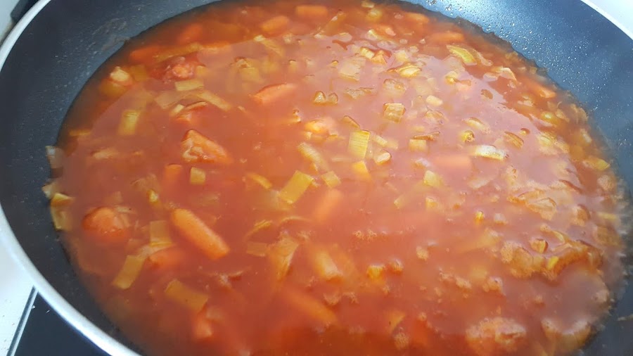 Añadimos el vaso de caldo de verduras y dejamos hirviendo durante unos 10 minutos hasta que las verduras estén tiernas.