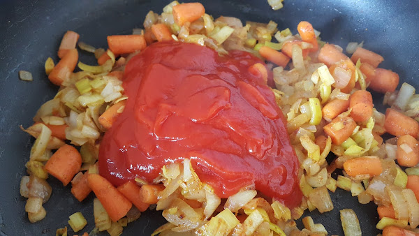 Añadimos 4-5 cucharadas de tomate frito sin azúcar añadido y mezclamos.