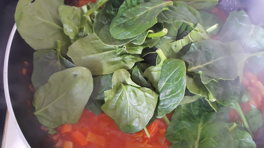 Agregamos las espinacas frescas y lavadas y dejamos tapado cocinándose a fuego bajo 2 minutos.