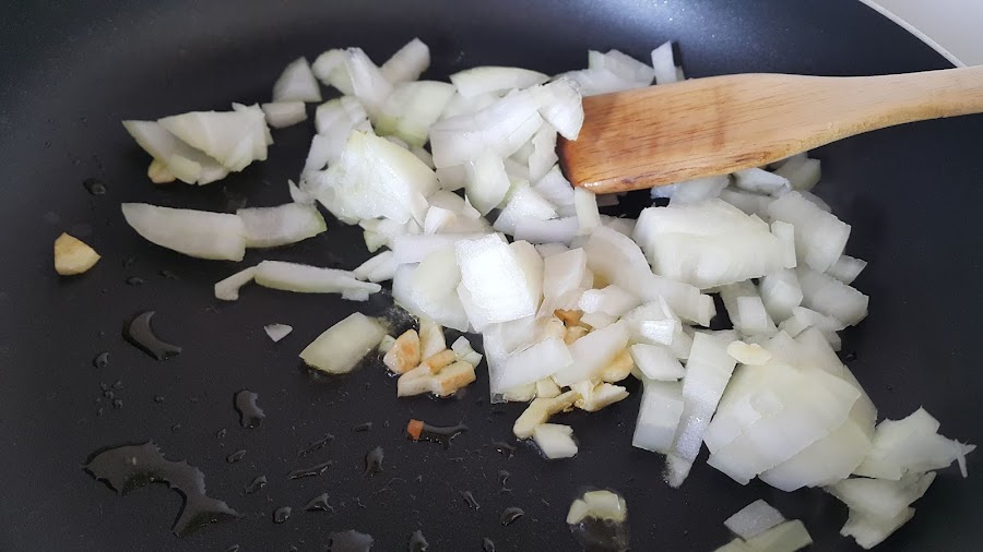 Empezamos pelando y picando la cebolla y el ajo. Los sofreímos con un poco de aceite de oliva en una sartén a fuego bajo con una pizca de sal.