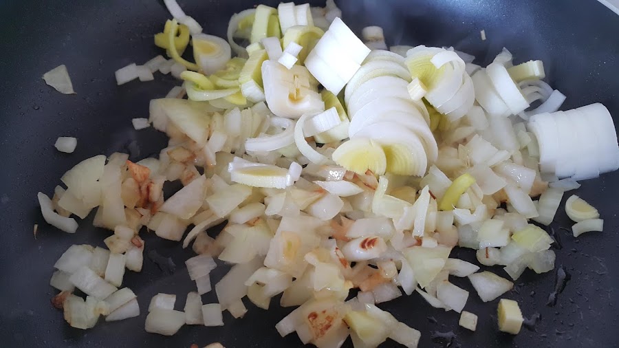 A continuación pelamos y picamos el puerro. Lo añadimos a la sartén y removemos bien.
