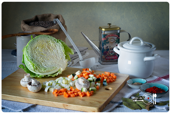 En una cazuela amplia echar un chorrito de aceite y sofreír bien todas las verduras cortadas en trocitos pequeños. Cuando estén sofritas añadir una cucharadita de pimentón, unos granos de comino y la hoja de laurel. Remover bien.