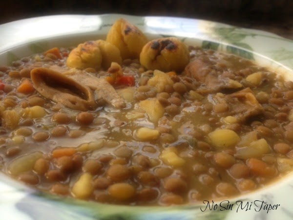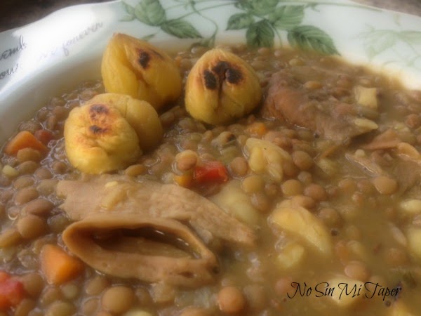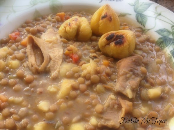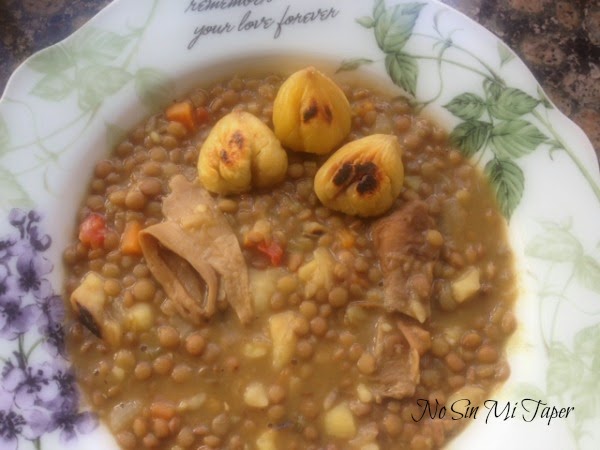 Y con las castañas... Un potajito de lentejas, de lo más bueno que hayáis probado. La inspiración la encontré en Eating Local in the Lou. Parece ser que es un potaje típico italiano, me pareció muy apropiado para esta época del año: castañas, setas y legumbres... ¿qué más se puede pedir?