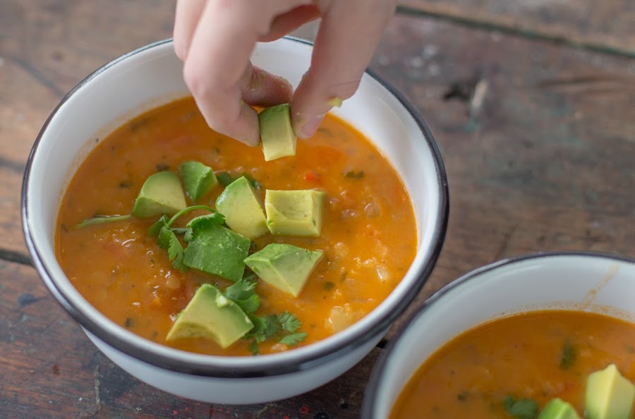 Al final agregar el jugo de limón, la cayena al gusto, mezclar y servir acompañado de cilantro fresco y cubos de aguacate. Algunos querrán más limón así que poner cascos de limón en la mesa.