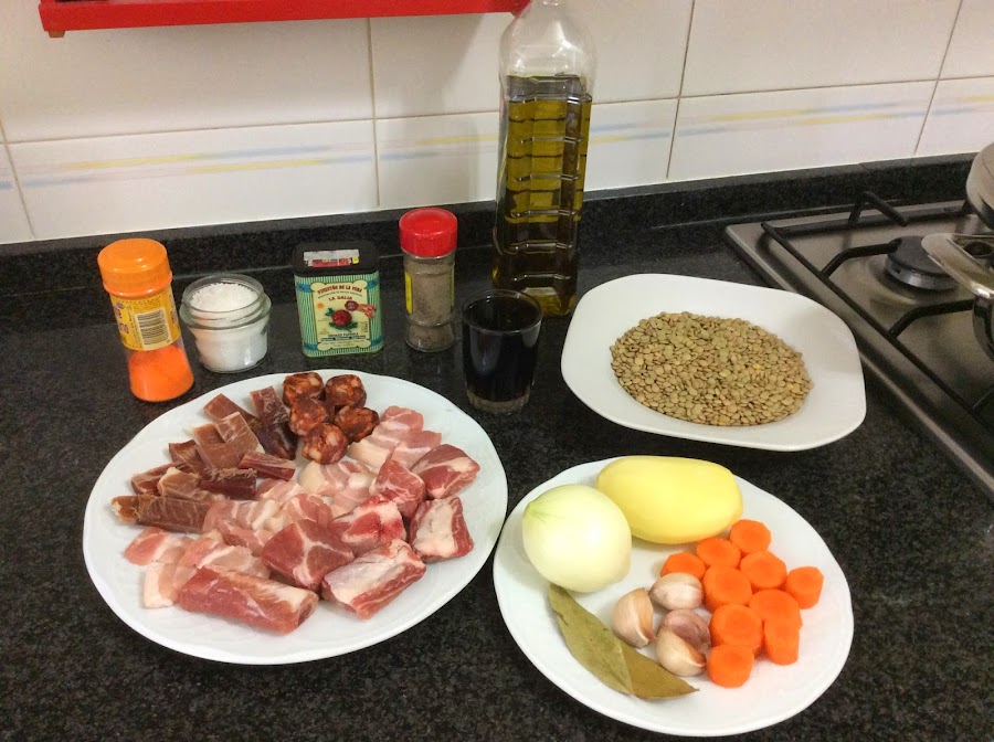a) Comenzamos lavando las lentejas, escurrimos y reservamos; troceamos el chorizo, el tocino fresco y el jamón serrano, así como las costillejas, la patata y la zanahoria. Ponemos a calentar nuestra olla y cuando la franja roja llegue a la figura del chuletón añadimos las 4 cucharadas de aceite de oliva virgen extra y ponemos a sofreír las costillejas de cerdo.