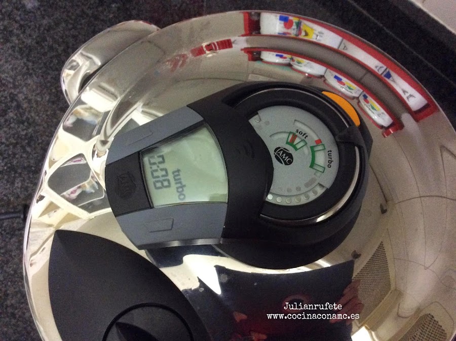 e) Programaremos 8 minutos en función "turbo" poniendo el fuego al máximo, cuando el audiotherm nos avise que la franja roja ha llegado a la función "turbo" bajamos el fuego al mínimo y dejamos pasar el tiempo programado; entonces apagamos el fuego y dejamos despresurizar la olla para que permita su apertura. El plato esta listo para servir.