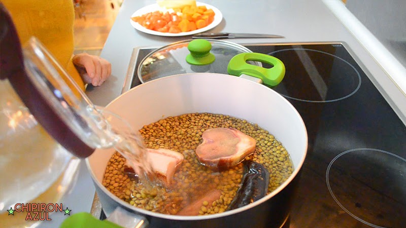 Pon las lentejas a fuego fuerte y mientras introduce el hueso de jamón, la morcilla, el tocino y el chorizo.