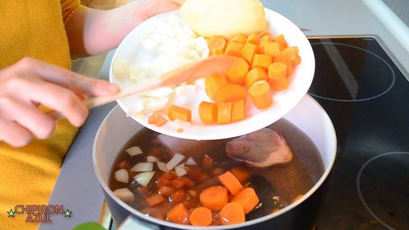 La patata es recomendable cortarla hasta que chasque con el cuchillo, de esta forma ayudamos a que el caldo del estofado espese sin necesidad de añadir otras féculas o almidones comerciales. Es decir, utilizamos el propio almidón que está dentro de las patatas para espesar el caldo de forma natural.