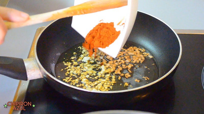 Ahora en una sartén a parte, haz un sofrito con el ajo y el pimentón dulce, ten cuidado de añadirlo ya al final y no freírlo apenas, ya que entonces daría un sabor algo amargo.