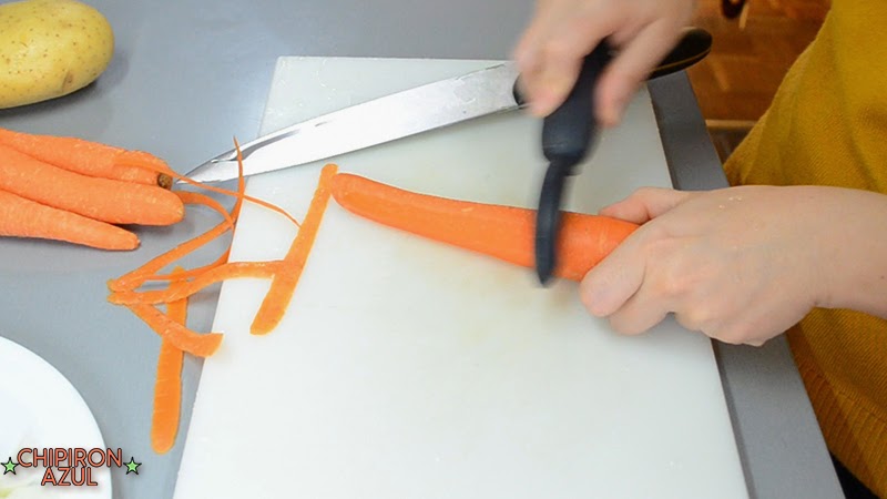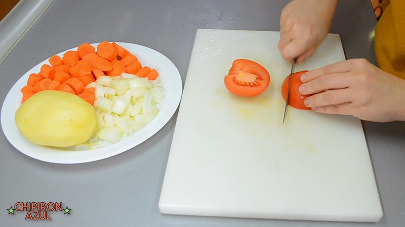 Trocea y pela las zanahorias, la media cebolla y el tomate. La patata sólo pélala y reserva entera.