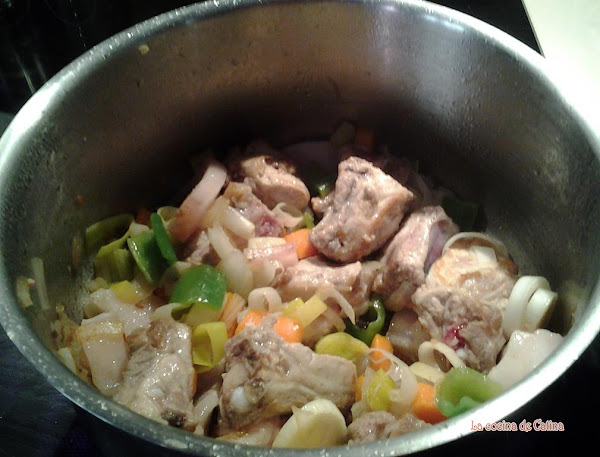 En una cazuela ponemos aceite a calentar, freímos las costillas y el tocino,