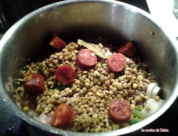 y ya incorporamos las lentejas, las patatas, el chorizo cortado en rodajas y las hojas de laurel.