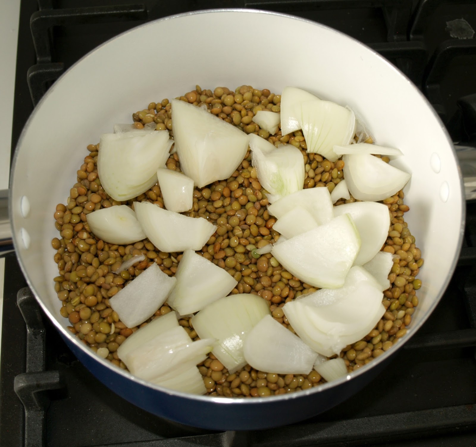 - La noche anterior ponemos las lentejas a remojo en agua. Al día siguiente las escurrimos y las colocamos en una cazuela.