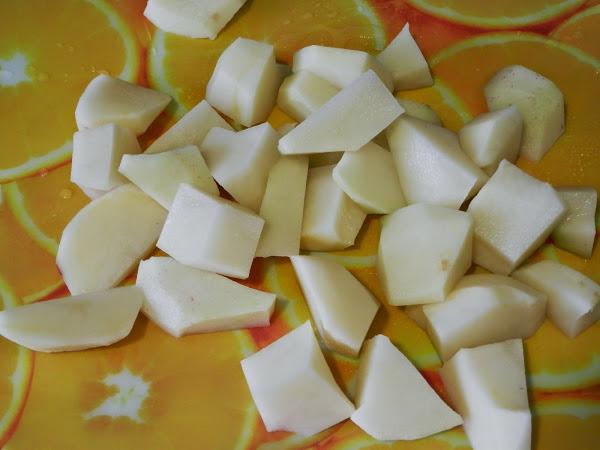 Cuando veamos que el guiso está, pelamos y partimos unas patatas chascándolas para que suelten el almidón y espese más el caldo.